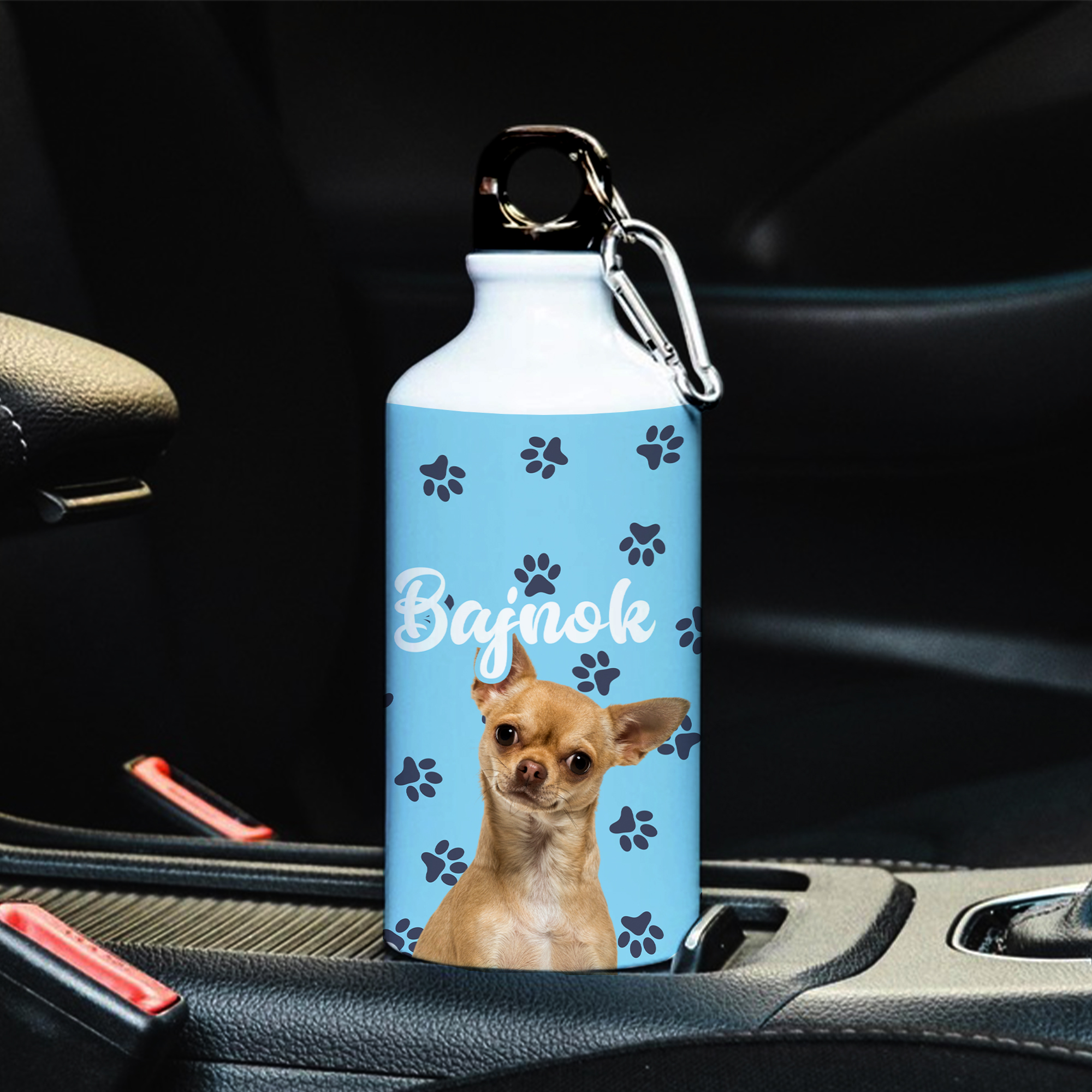 Csivavás kulacs, névvel, fényképpel, kék háttérrel