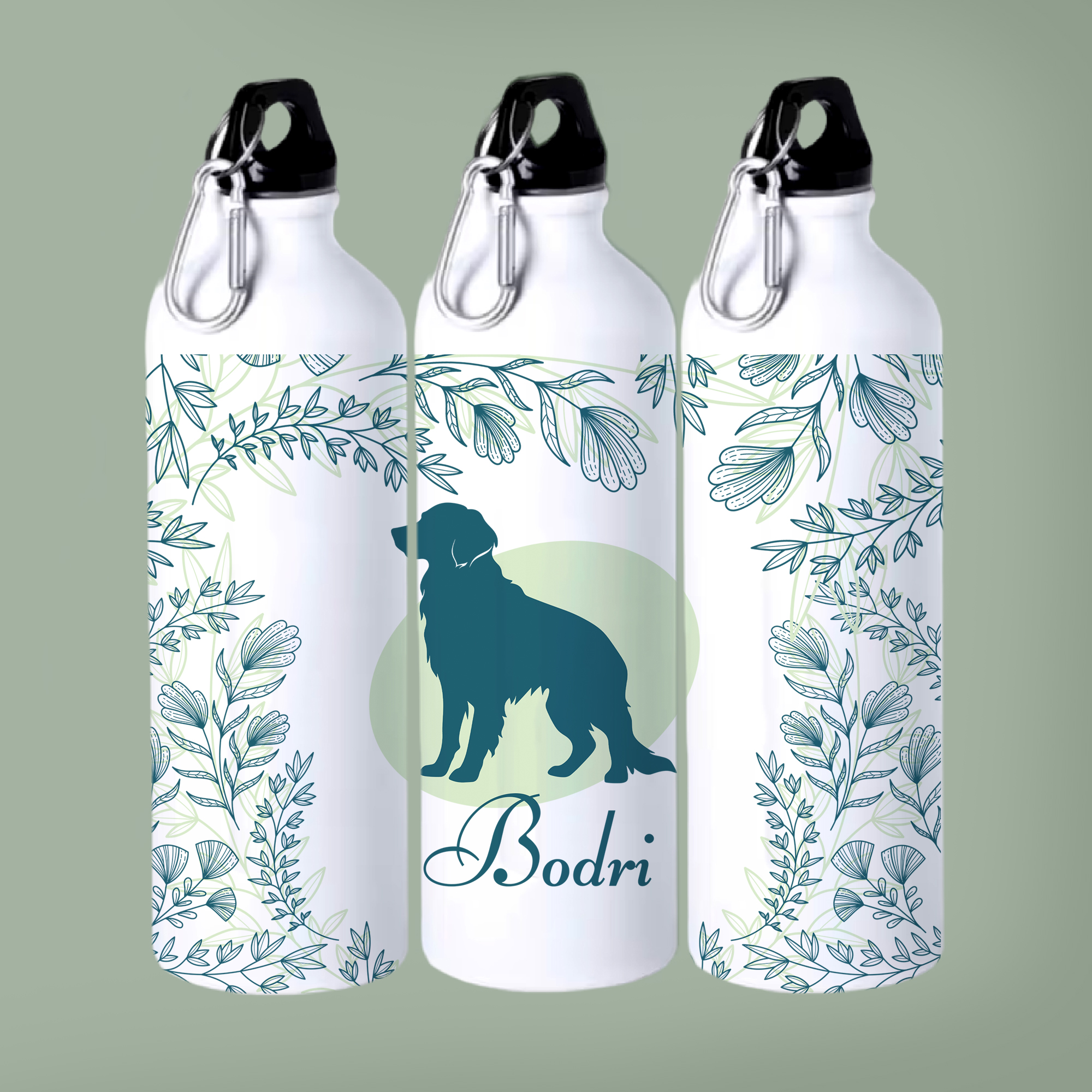 Golden retrieveres kulacs zöld növényekkel és névvel