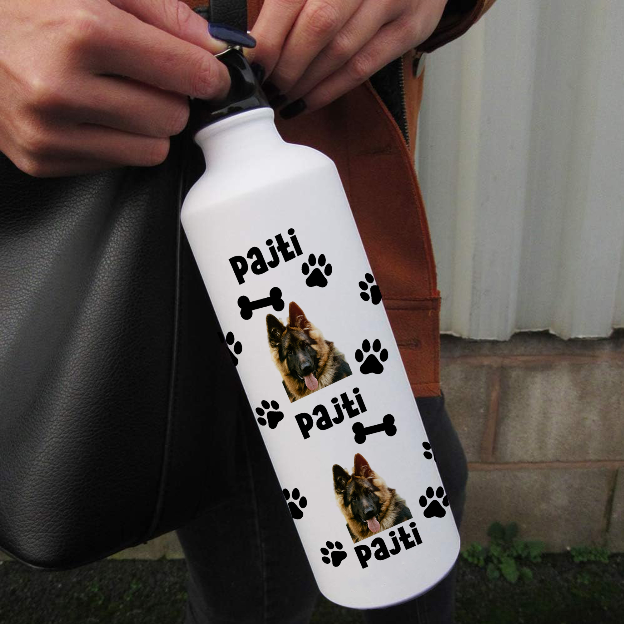 Német juhászos kulacs névvel és saját képpel
